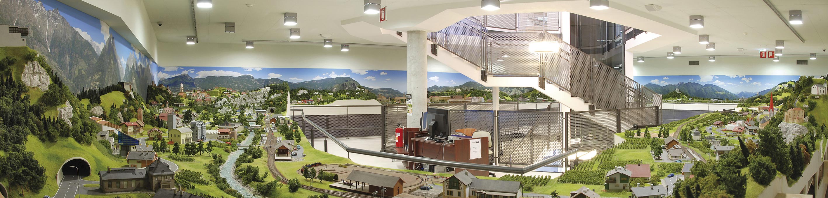 Die Phantasieanlage „Mittelgebirge“ steht ebenfalls in der Eisenbahnwelt in Südtirol. 13,5 lfm exakt angepasste Landschaftskulisse – vom Wintersport im Gebirge bis zur pulsierenden Großstadt. Sehen Sie mal genau hin – wo endet die Modelllandschaft und wo beginnt die eigentliche Kulisse?
